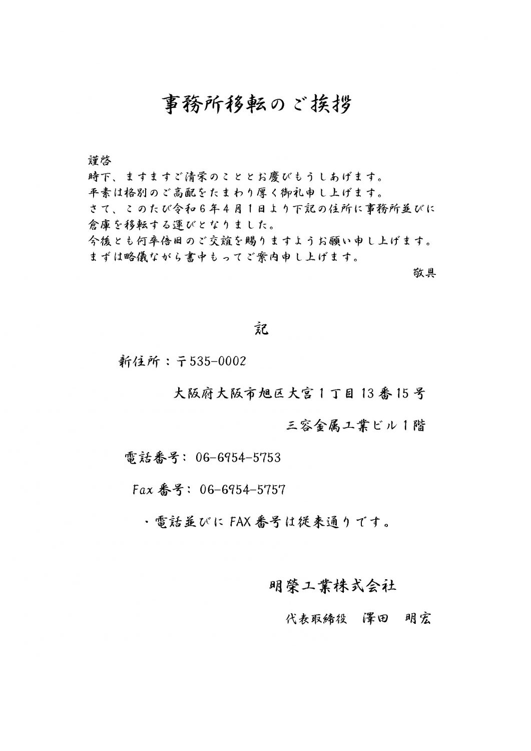 【事務所移転のご挨拶】令和6年4月1日 事務所並びに倉庫を移転いたしました。|大阪でサッシの修理・メンテナンス・交換なら明榮メンテナンスへ